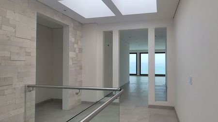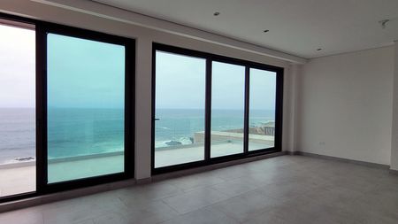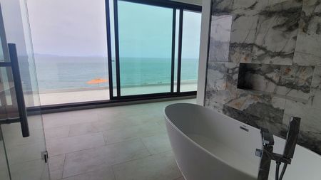 La siguiente habitación tiene un pequeño balcón, un closet y otro closet pequeño de servicio más un amplio baño con tocador. En el siguiente nivel encontraremos una vista completa al mar que te quita el aliento con una pared de ventanal abatible que conecta a la terraza, sala, con mini bar, comedor y una gran cocina cubierta con granito.